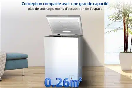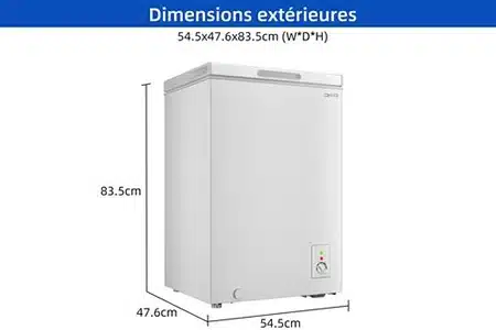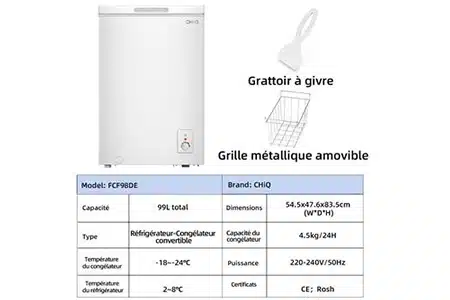 Le congélateur coffre CHiQ 99L FCF98DE 2023 est la solution idéale pour un stockage optimal de vos aliments surgelés. Son design compact (54,5 x 47,6 x 83,5 cm) permet une intégration facile dans une cuisine, un garage ou une buanderie, tout en offrant une capacité de 99L pour stocker viandes, légumes, et glaces.